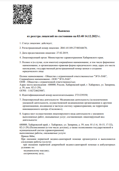 Диапазоны цен на приём врачей и специалистов, услуги и диагностику в медицинской клинике Эго-лаборатория в Хабаровске.
